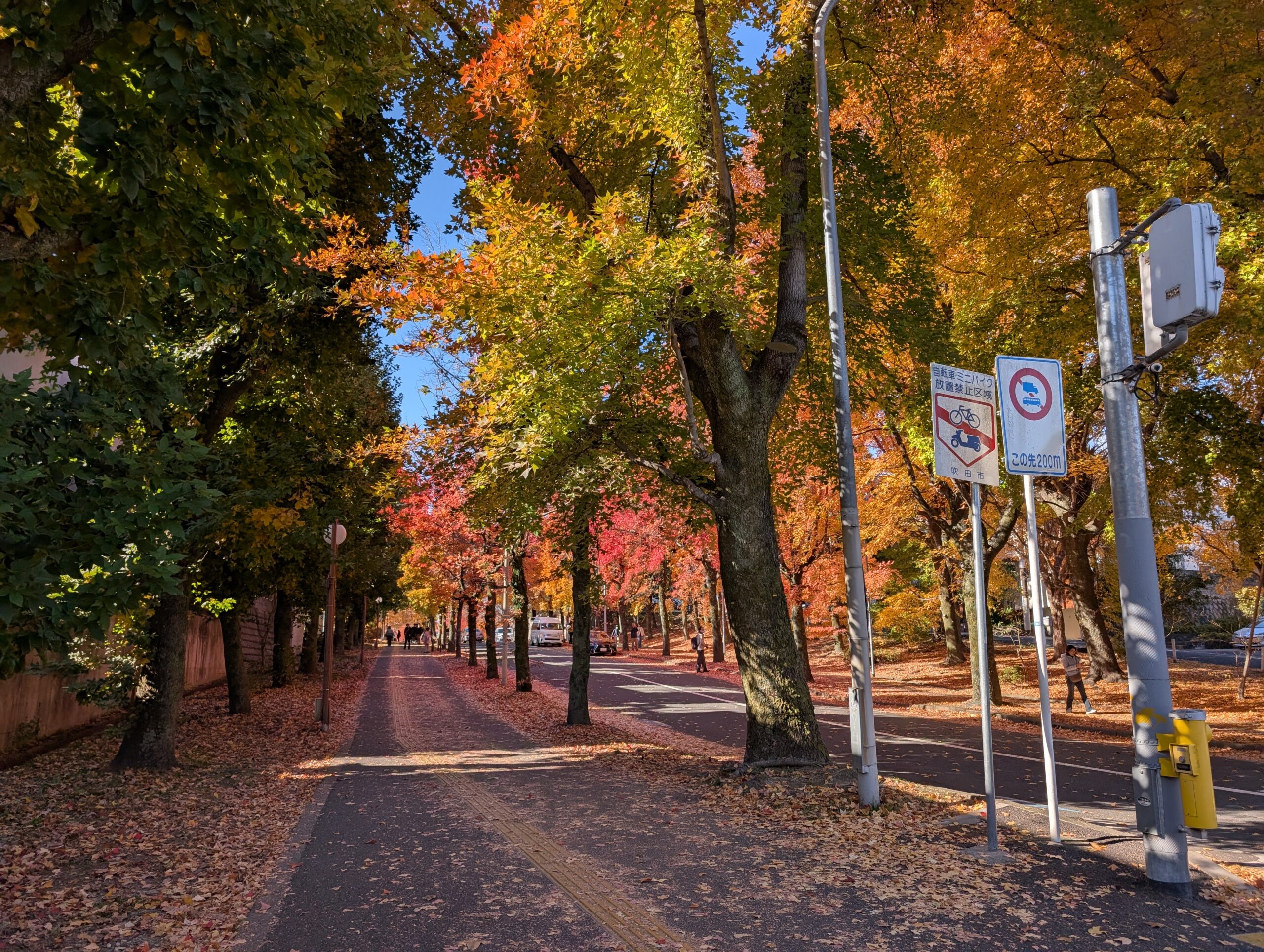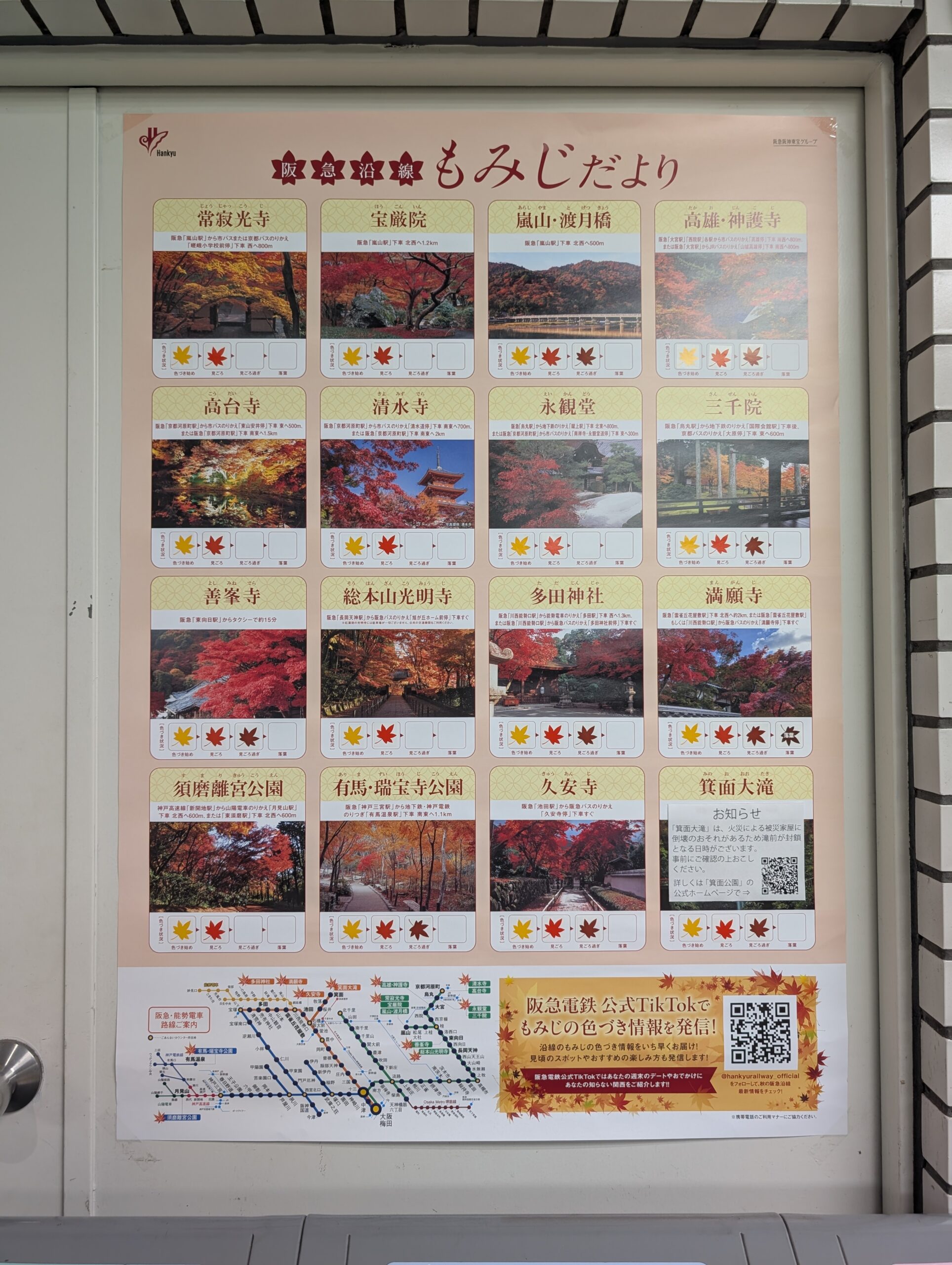 车站正好贴着一个红叶情报表,上面用小贴纸每天更新红叶情况,还挺方便。我看了一会儿,有了个大概的了解,抵达时候正巧居然是最盛。箕面瀑布火灾的事前两天在新闻也看到了,估计是看不成。
