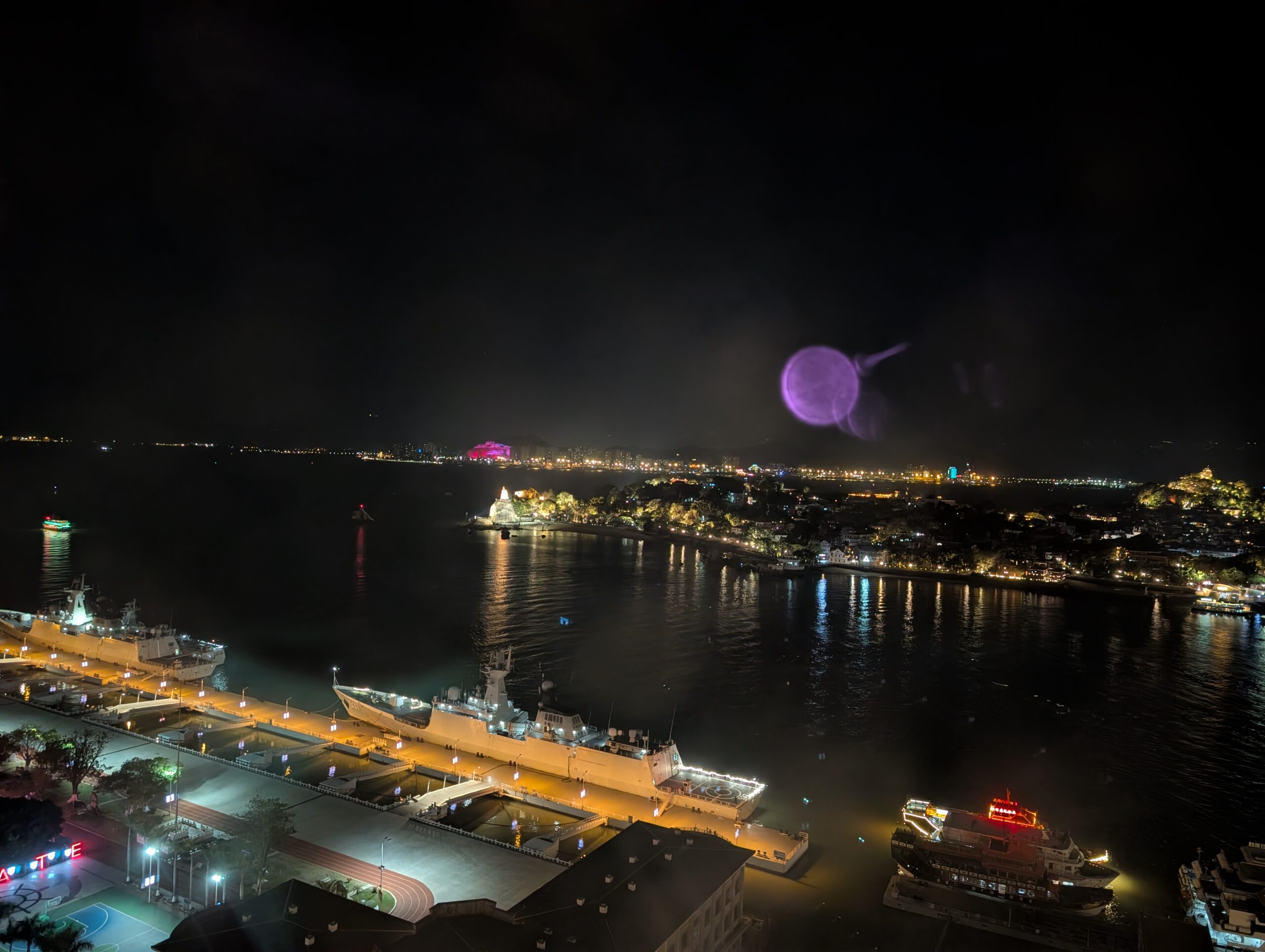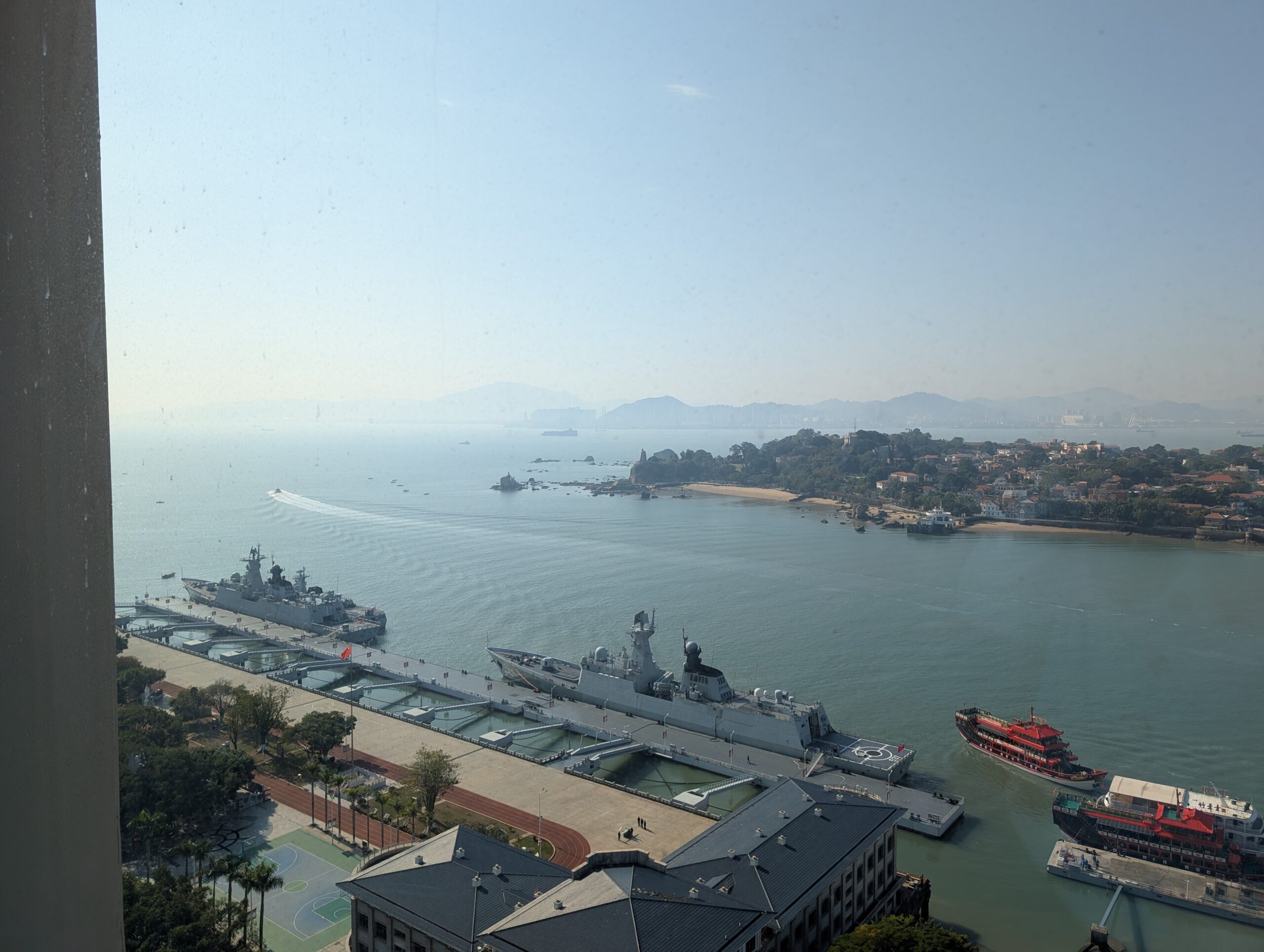 楼下停了两艘军舰,早上起来还能看到士兵训练,操场上还有士兵打篮球。第一天抵达的时候,从机场打车来宾馆,遇到一个滴滴司机,说话的嗓门特别大,还很难听,像鸭子。他说起岸边这两搜军舰的雷达系统,又说起各国军舰的不一样的特征。我问他是军迷还是学雷达的。他说自己是退役军舰指挥,理解了,肃然起敬。问他出海一般多久,执行什么任务,他真是竹筒倒豆子,不知道是不是憋久了,还说起钓鱼岛的任务什么的。我问他:这能说么?然后他终于不说话了。