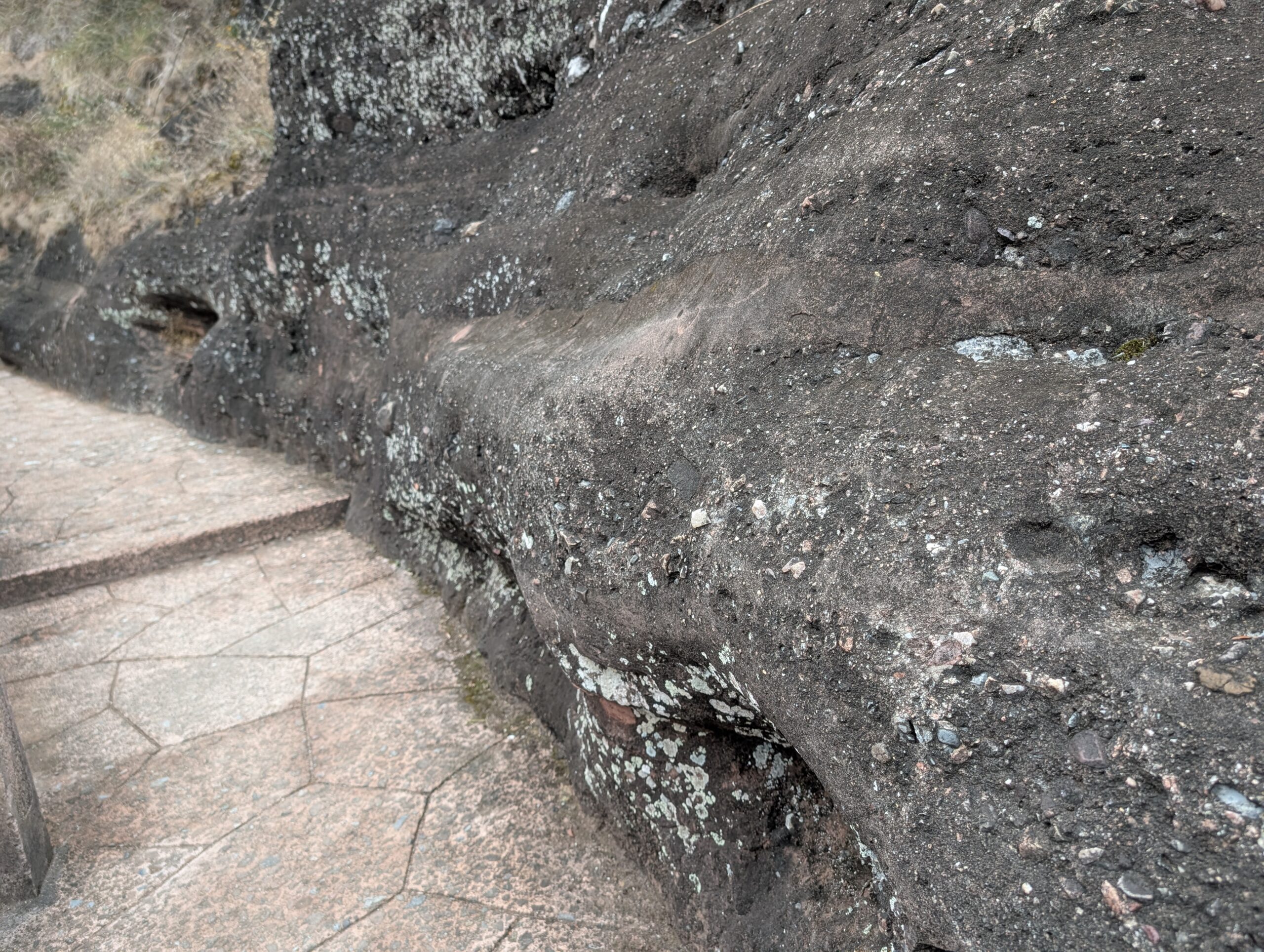 原来是海底,现在露出成山,岩石里面像嵌了很多小石头,仿佛能抠下来。其实并不能。
