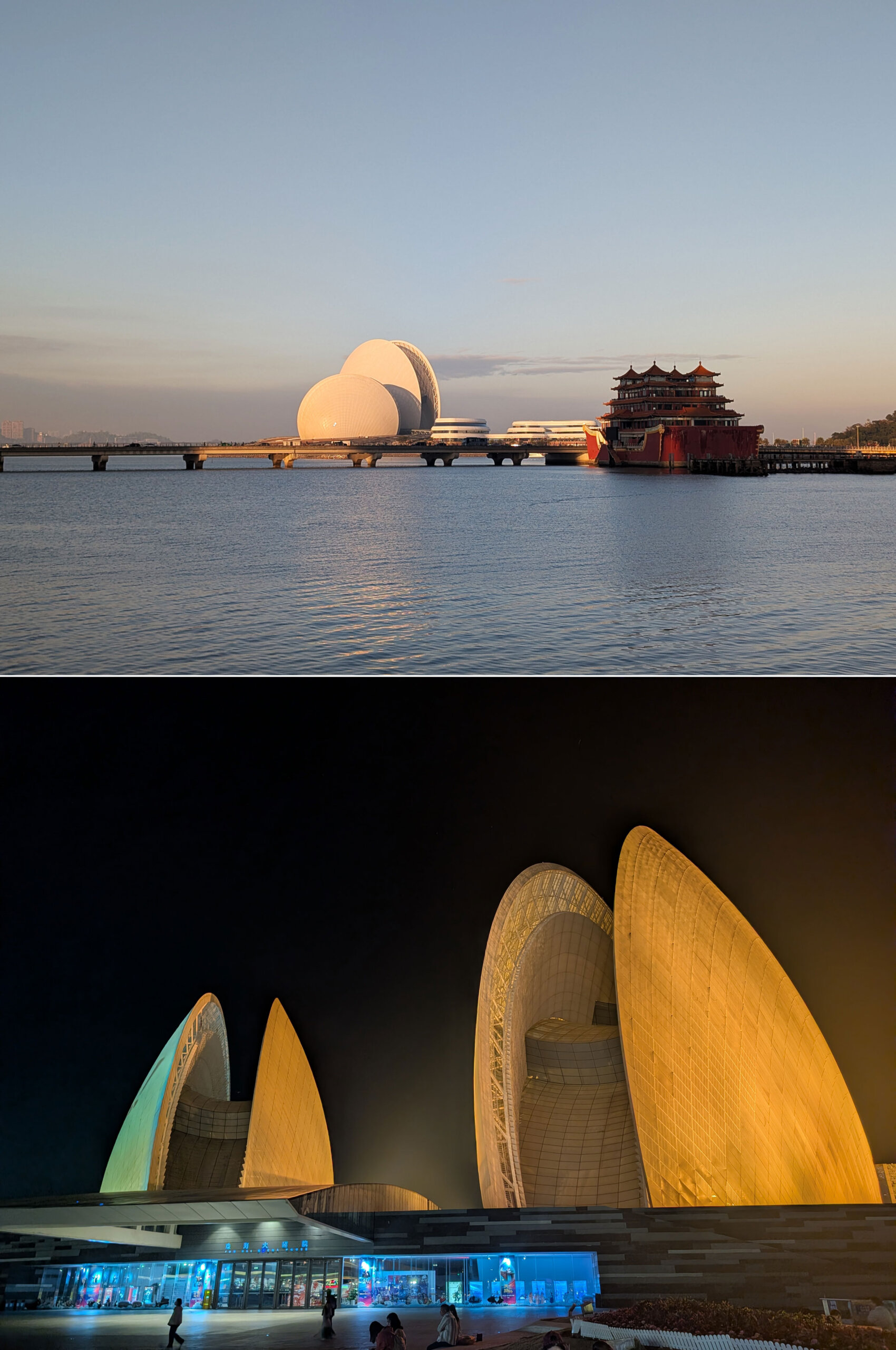 夜幕降临,日月贝变成两块金黄的月饼。站在广场上,它甚至像外太空的金星土星贴脸降临。我有点异物恐惧,却又深深折服于巨型建筑的恢弘气势。广场上商业繁茂,游人如织,孩子们欢笑打闹,一副现世安稳的休闲景象。